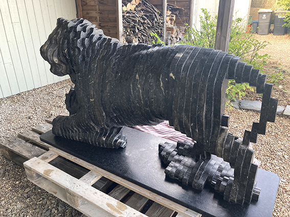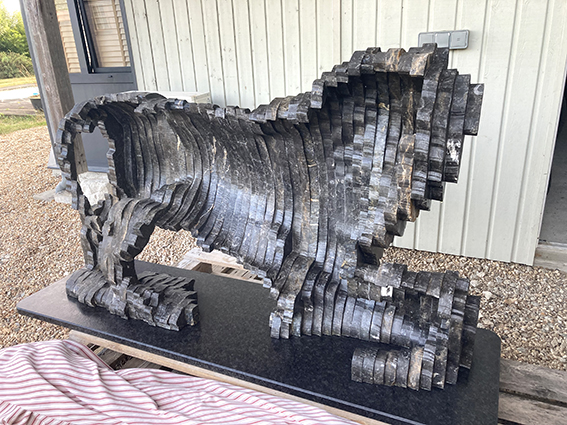 Imitation de veinages de marbre sur la restauration d’une sculpture de lion en vrai marbre dans le but de fondre les tranches de nouveau marbre de couleur différente avec celles d’origine – Peinture à l’huile – Commande particulière © Christelle Fargue