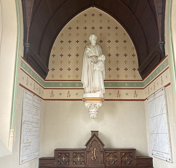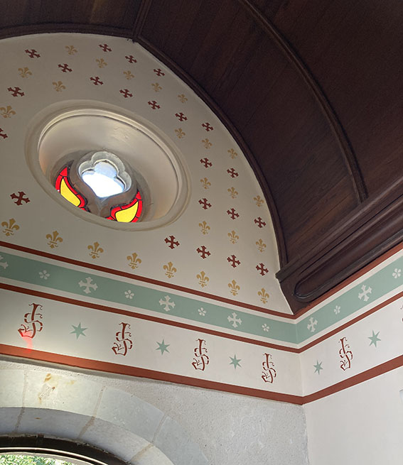 Création et réalisation d’un décor mural polychrome avec création de pochoirs dans le style fin XIXe-début XXe siècle – Surface d’environ 11 m2 – Peinture à la caséine – Chapelle particulière – © Christelle Fargue