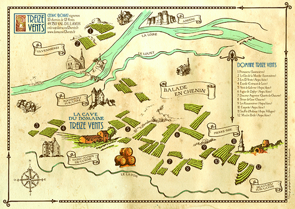 Création illustration, graphisme carte des vignobles du Domaine Clos Galerne/Treize Vents – Anjou